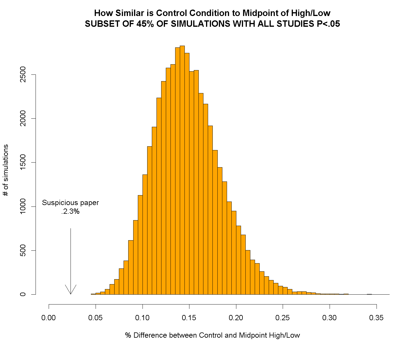 For each simulated paper we have two measures of excessive similarity “Control is too close to High-Low midpoint,” and “SD of F-values”. These proved uncorrelated in our simulations (r = .004), so they provide independent evidence of aberrant results, we have a conceptual replication of “these data are not real.” [3]