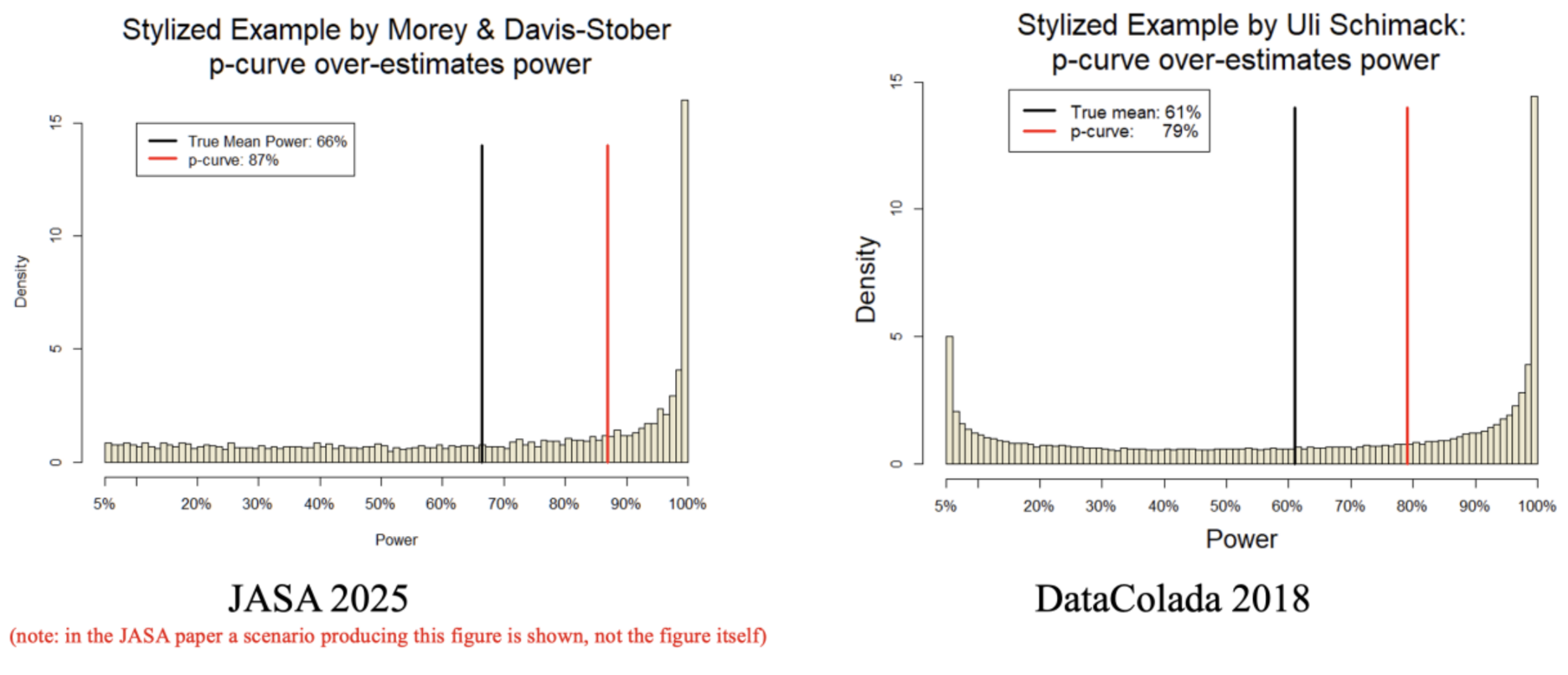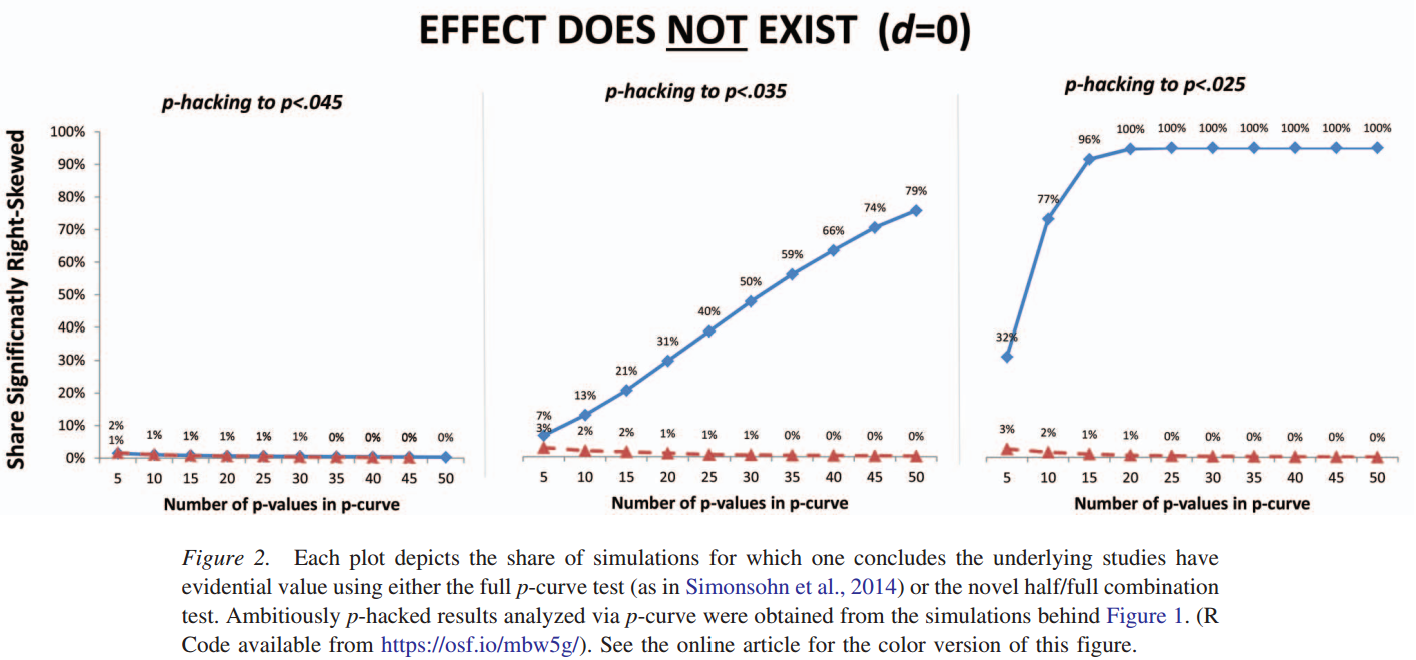 Two of the four properties (monotonicity violations & impact of outliers) motivated design decisions of our p-curve app back in 2014 & 2015, such as communicating the # of p>.05 results excluded from p-curve, reporting robustness results excluding extreme p-values, and switching to the Stouffer method so as to be less sensitive to p-values that were extremely low or extremely close to .05. We did pay less if any attention to the issue specifically at the .025 cutoff, and the JASA paper focuses on that cutoff for some examples. In terms of the third criticism, Stouffer having lower power than Fisher, when we made the switch in our app, from Fisher to Stouffer, we redid all simulations from our published paper and reported (modest) drops in power with Stouffer. But we were unaware of Marden's (1982) general proof of Stouffer not having maximal power. In terms of the fourth criticism, that heterogeneity biases p-curve, it was made by a few authors back in 2018, and we responded to it sixty-two blogposts ago: in https://datacolada.org/67.[↩]