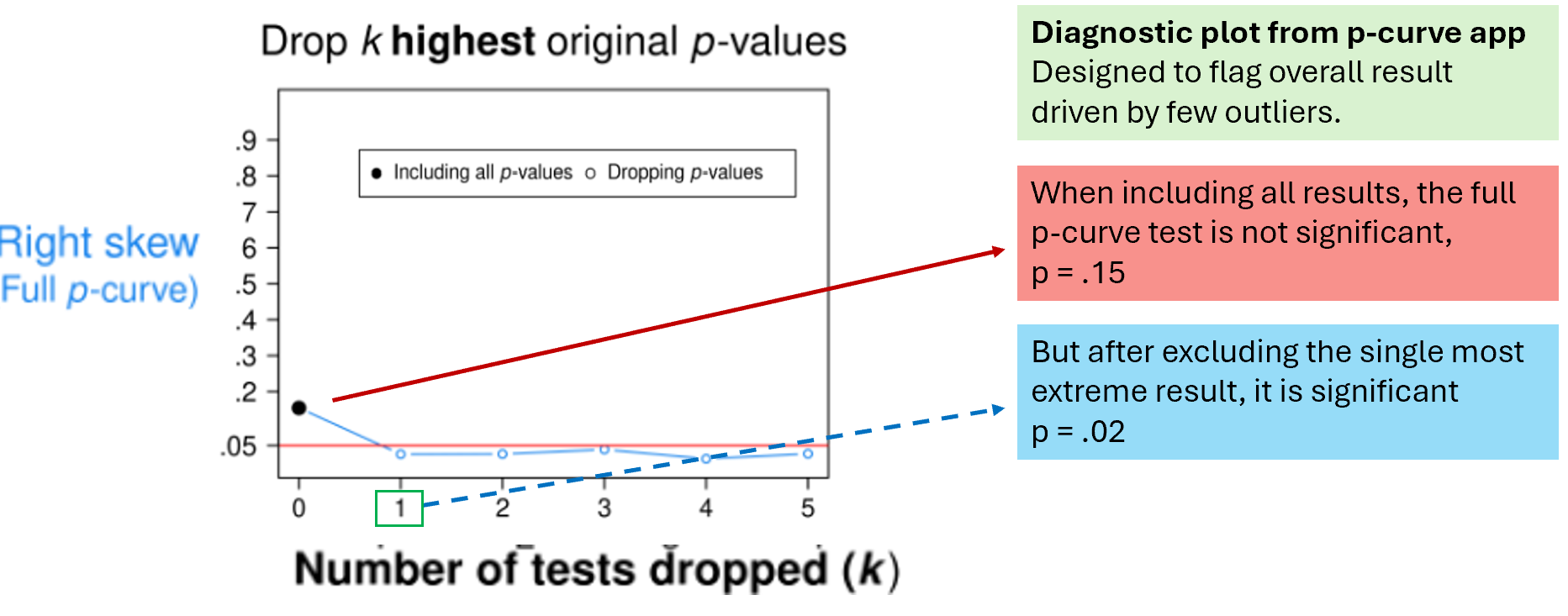 Figure 3. p-curve's diagnostic tools diagnose results driven by a single extreme p-value.