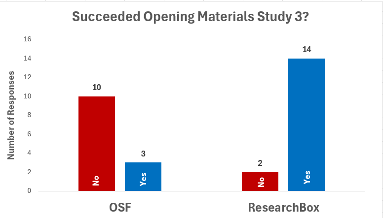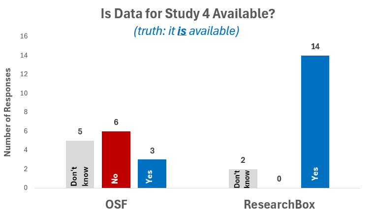 [↩] - My survey had a couple extra questions. I opened asking if there was data for Study 1, the right answer was "no", I wanted it as a control in case everyone said "yes" in the OSF for Study 4. In ResearchBox 14 people say "no", 2 said "don't know". In OSF 9 people said no, 1 said "yes", 4 said they couldn't tell. I also asked how fast the website felt, results were nearly identical to ease of use. I also timed how long it took people to provide their answers; the median successful OSF response about Study 4 took 126 seconds, in ResearchBox, 31 seconds [↩]