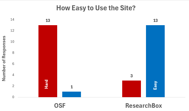 I then randomly assigned N=30 Cloudresearch participants to get the OSF or the ResearchBox link and asked them questions about the files. I ran a ridiculously small sample because I expected ridiculously large effects. The results supported my intuitions.