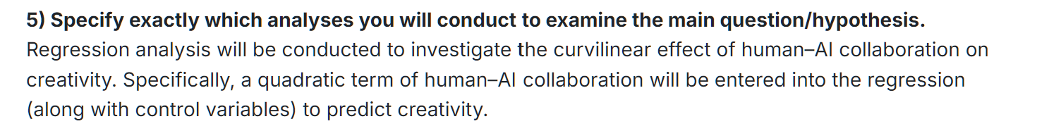 The analysis in the pre-registration (https://aspredicted.org/DC2_WKN ) does not indicate which covariates will be included in the regression. It also doesn't specify how the quadratic regression will be interpreted. It reads:The paper does report results for alternative specifications in the supplement, and the main text notes that the quadratic effect of AI is not significant when all covariates are excluded (p = .14, page 3302). There is also something a bit odd with sample size. The sample size reported in the paper, N=188 pairs, is larger than that in the AsPredicted pre-registration (N=150), but the paper apologizes for it being too small.