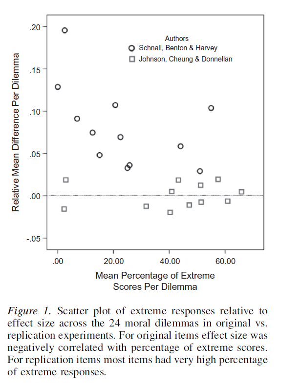 - This blogpost was drafted on Thursday May 29th and was sent to original and replication authors for feedback, offering also an opportunity to comment. The dialogue with Simone Schnall lasted until June 3rd, which is why it appears only today. In the interim Tal Yarkoni and Yoel Inbar, among others, posted their own independent analyses. [↩]